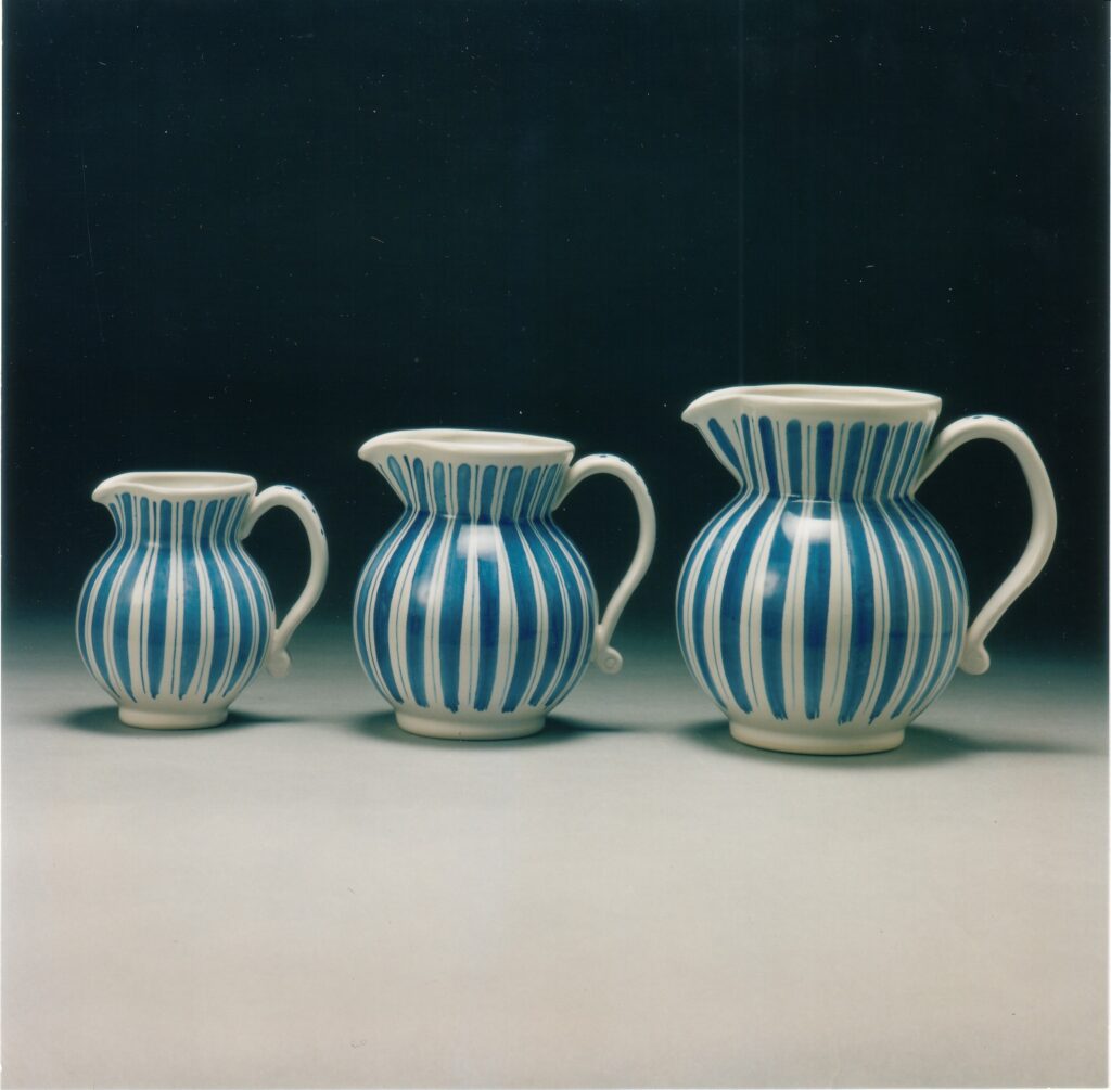 And don’t be fooled by the seeming simplicity of these pieces. Using just a brush to create straight lines on a curved surface (no ruler mind) when the paint is sucked up the second it hits the unfired glaze takes an awful lot of practice. And skill. Our post-war paintress-turned thrower Pam Goddard reckoned if you could paint Rye Pottery’s Cottage Stripes onto these curvaceous jugs, well, you could paint anything.