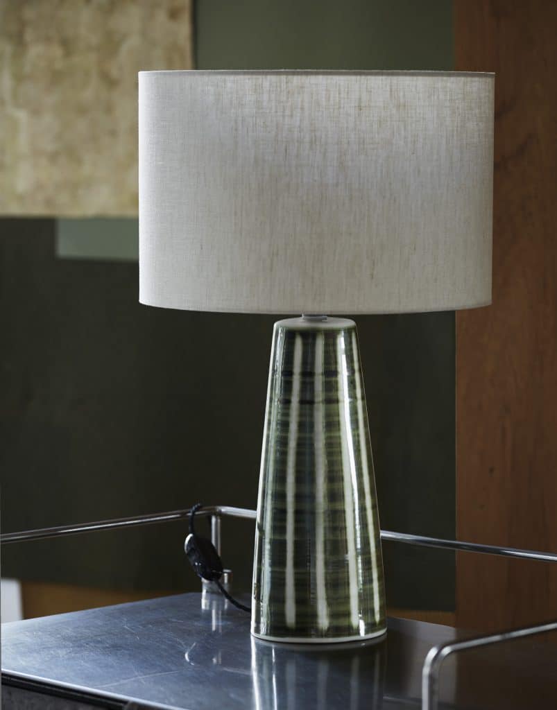 Our LB1 Lamp base is shown here in a reworked take on our Cascade decoration – hand-painted in Denmark Green on a white glaze. This design works well as a mis-matched pair of table lamps with our new Soho Stripe design in Denmark Green, originally conceived for Soho House’s White City House hotel in the old BBC “Helios” building in London.