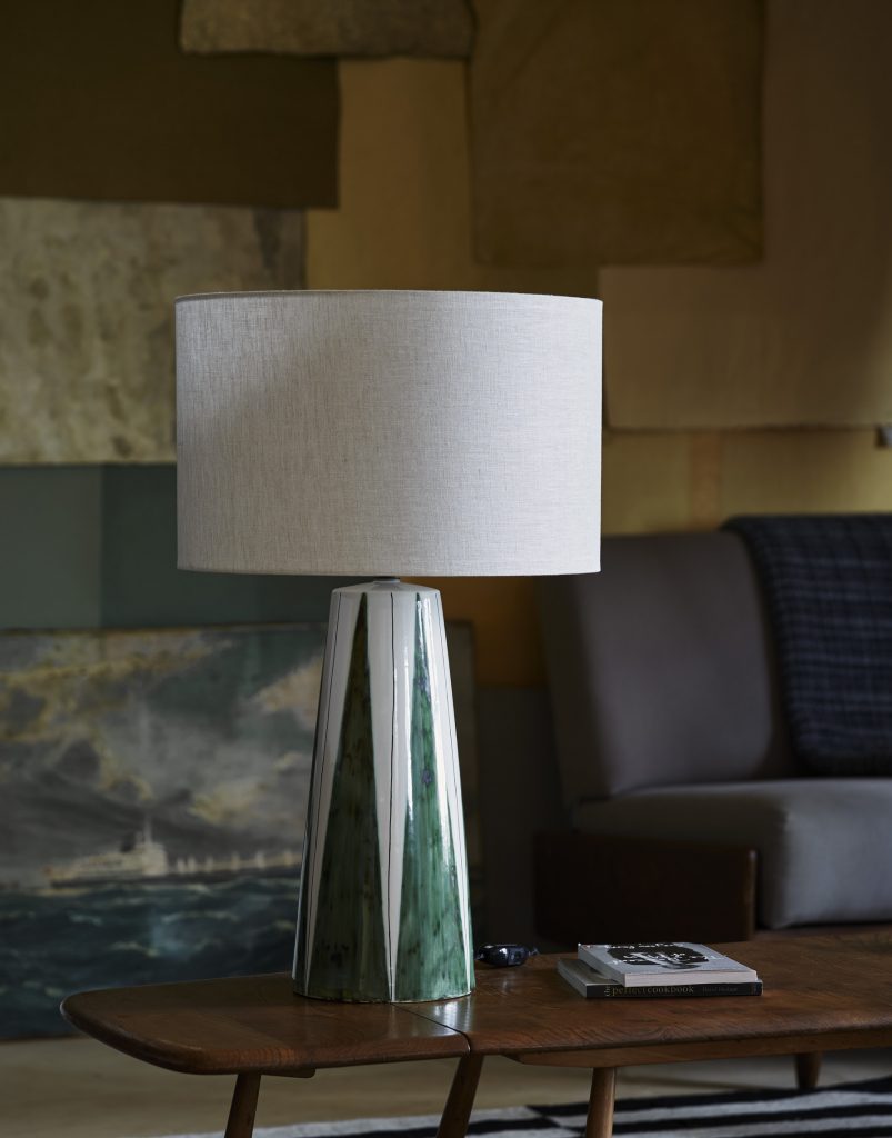 The Mid-century Modern LB1 Table Lamp in our Soho Stripe decoration, hand-painted in Denmark Green. Originally designed for the White City House hotel in the BBC’s former Helios HQ in London. Sits well as a mis-matched pair with our Cascade Design in Denmark Green.