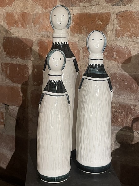 Originally designed as an oil & vinegar bottle this piece has been out of formal production for decades. For the 21st Century, her head is fixed firmly in place and has been turned round a full 180 degrees. We think her new stance, complete with a new surface design give her an enchanting, if demure, demeanour. She is decorated using free-hand brush work & a technique we call Tracery giving her a beautiful textured white dress.