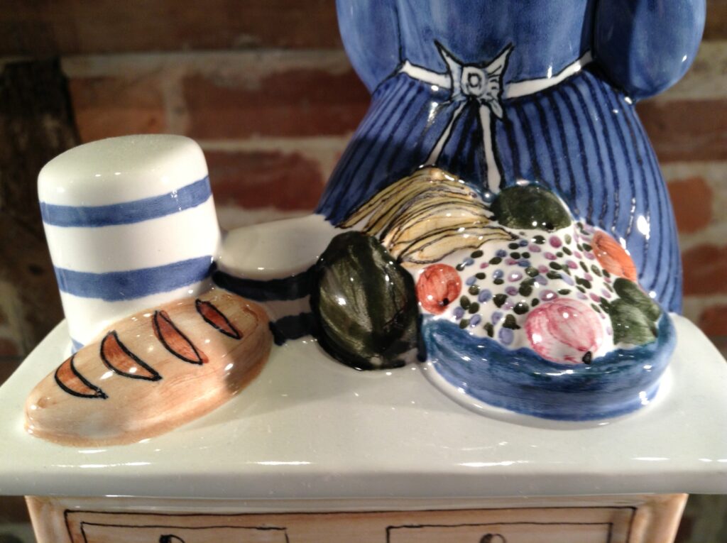 The folds in the strong sculptural shape of her dress and cooking apron are beautifully emphasised by the hand-painted soft Delphinium Blue which is over-layed with a technically challenging Cobalt Stripe.